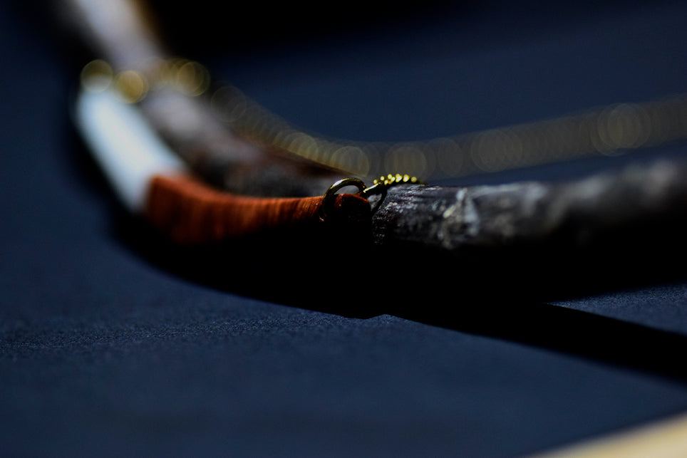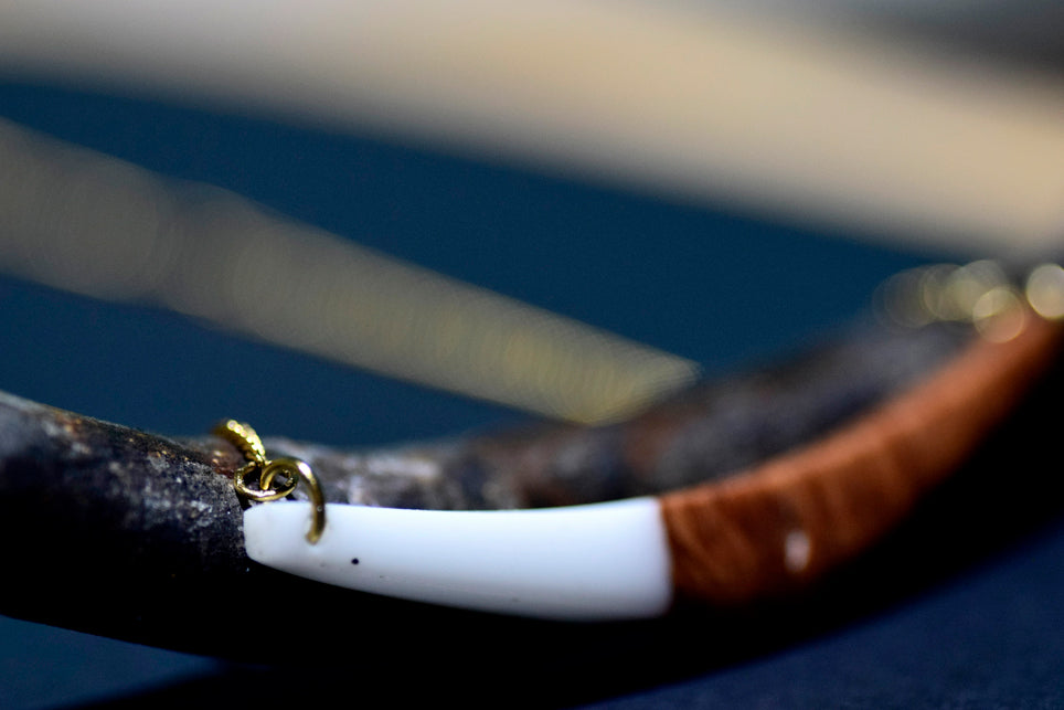 Collana girocollo a fascia realizzata in radice di Erica arborea e resina. Catenina e ganci in acciaio inossidabile ipoallergenico.