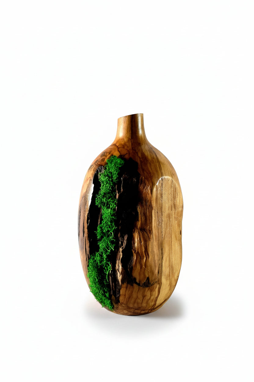 Vaso decorativo in legno secolare di Ulivo di origine pugliese. Realizzato con muschio stabilizzato. Adatto anche per fiori freschi. Foro impermeabilizzato. Finitura di gomma lacca.